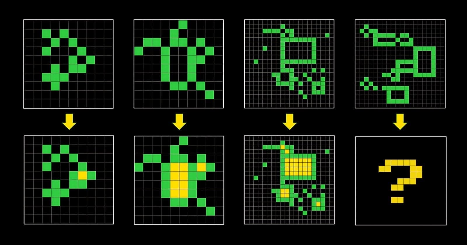 Humans, including children, solve these puzzles by extracting principles. "Ah, the squares turn yellow when they are enclosed by green squares." Models, even frontier ones, mostly fail. When they succeed, researchers found, it's often because they've memorized similar patterns, not because they've understood the underlying logic. Change the colors or rotate the grid, and performance collapses.