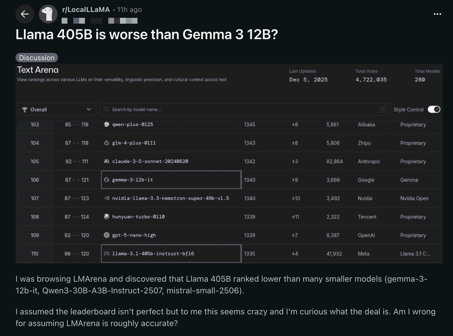 The ranking collapsed. Overnight, Llama plummeted thirty positions.